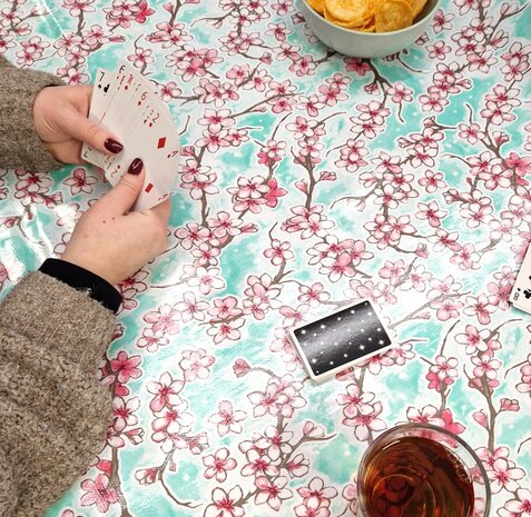 Vrolijk mintkleurig Mexicaans tafelzeil met een mooie kersenboesem print Dit tafelzeil fleurt je tafel helemaal op! Het tafelzeil is makkelijk afneembaar, dus ook ideaal geschikt voor de keukentafel! Wil je zelf met tafelzeil knutselen of bijvoorbeeld kastjes decoreren met allemaal verschillende stukjes Mexicaans tafelzeil? Dit tafelzeil is al verkrijgbaar vanaf 50 centimeter! - Breedte: 120 centimeter - Lengte: Vanaf 50 centimeter tot 11 meter (een rol tafelzeil) - Profiteer van korting op een volle rol - Weergegeven prijs is per halve meter - Materiaal: Bedrukt PVC, harde rug en dun laagje draadjes textiel - Machinewasbaar: Nee