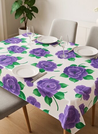 Proefstaaltje: Mexicaans tafelzeil paarse rosas op wit € 2,25