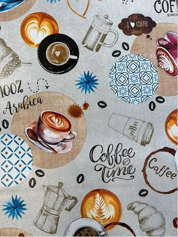 Super gezellig tafelzeil met koffie soorten, sfeervol op elke tafel. Dit tafelzeil wordt speciaal voor jou op bestelling rond gesneden! Dit tafelzeil heeft een vaste doorsnee van 140cm. Daar de breedte van dit tafelzeil altijd 140cm is, is het helaas niet mogelijk om dit tafelzeil groter te bestellen.