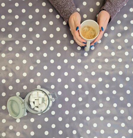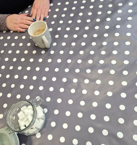 Proefstaaltje: Tafelzeil donkergrijs met witte stippen € 2,25
