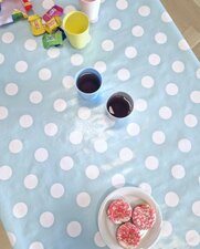 Proefstaaltje: Tafelzeil lichtblauw met stippen € 2,25