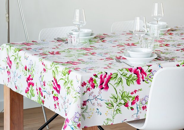 Kleurrijk tafelzeil met allemaal pioenrozen! Dit sfeervolle tafelkleed van pvc kunnen wij voor jou per 50cm op maat snijden. Het tafelzeil is al verkrijgbaar vanaf 50 centimeter. - Breedte: 140 centimeter - Lengte: Vanaf 50 centimeter tot 20 meter (een rol tafelzeil) - Weergegeven prijs is per halve meter - Materiaal: Geprint pvc met zachte non woven vliesrug - Machinewasbaar: Nee