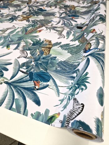 Een tafelzeil met de bekende botanische bladeren print met jungle animals erop. Dit palmblad motiefje is momenteel helemaal in de mode. Het zeil is verkrijgbaar vanaf 50 centimeter! - Breedte: 140 centimeter - Lengte: Vanaf 50 centimeter tot 20 meter (een rol tafelzeil) - Prijs: weergegeven prijs is per halve meter - Materiaal: Geprint pvc met zachte non woven vliesrug - Machinewasbaar: Nee