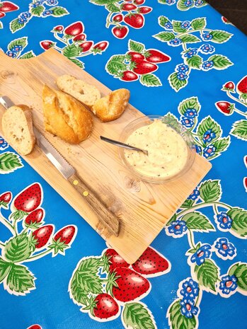 Kitsch Kitchen tafelzeil met aardbeien creëert een zomerse sfeer op jouw tafel. Dit aarbeientafelzeil is zo sterk dat het zelfs gebruikt wordt om er tassen en andere leuke accessoires mee te maken. Het pvc tafelkleed is met een vochtig doekje makkelijk af te nemen. Het is sfeervol, decoratief en functioneel op tafel en al verkrijgbaar vanaf 50 centimeter. - Breedte: 120 centimeter - Lengte: Vanaf 50 centimeter tot 11 meter (een rol tafelzeil) - Weergegeven prijs is per halve meter - Materiaal: Bedrukt PVC, harde rug en dun laagje draadjes textiel - Machinewasbaar: Nee