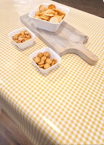 Vrolijk en een tintje zomers, dat is dit Kitsch Kitchen tafelzeil met ruitjes geel. Dit zeil is heel gemakkelijk afneembaar en is dus ook ideaal geschikt voor de keukentafel en voor mensen met kinderen. Wil je zelf met tafelzeil knutselen of bijvoorbeeld kastjes decoreren met allemaal verschillende stukjes Mexicaans tafelzeil? Dit tafelkleed is al verkrijgbaar vanaf 50 centimeter! - Breedte: 120 centimeter - Lengte: Vanaf 50 centimeter tot 11 meter (een rol tafelzeil) - Profiteer van korting op een volle rol - Weergegeven prijs is per halve meter - Materiaal: Bedrukt PVC, harde rug en dun laagje draadjes textiel - Machinewasbaar: Nee