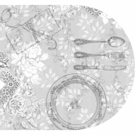 Brocant grijs tafelzeil diner met borden, hartjes en kantprint. Ovaal tafelzeil wordt op bestellen voor jou met een mal ovaal gesneden. Het tafelzeil heeft een standaard breedte van 140 centimeter. De lengte mag je middels het keuze menu zelf bepalen.