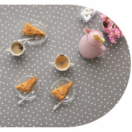 Mooi grijs tafelzeil met schattige witte stipjes. Dit ovale tafelzeil wordt speciaal voor op bestelling ovaal gesneden. De breedte is 140cm, de gewenste lengte kun je in het keuze menu kenbaar maken.