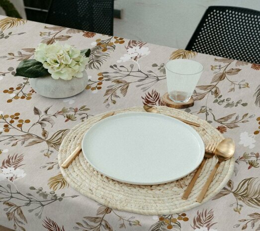 Dit wasbare gecoate tafelzeil geeft een sfeervolle en natuurlijke uitstraling. Dit tafelzeil is behandeld met een speciale coating waardoor het zeil met een vochtig doekje eenvoudig af te nemen is. Het geweven