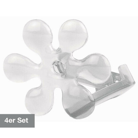 Voorkom dat je tafelkleed of tafelzeil van tafel waait of glijdt. Gebruik deze handige tafelkleedklemmen. De klem klemt het tafellaken als het ware aan het tafelblad vast waardoor het kleed niet kan verschuiven of van tafel waaien. - Set bestaat uit 4 tafelkleedklemmetjes bloemen - Materiaal metaal - Afmetingen: circa 7x4x5cm - Niet geschikt voor tafels met hele dikke tafelbladen