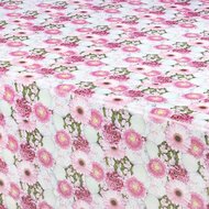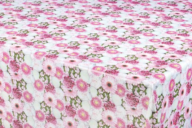Gerbera's zijn vrolijke, kleurrijke bloemen die veel gebruikt worden in boeketten en als snijbloemen. Gerbera's symboliseren geluk, optimisme en zuiverheid. De kleur van de gerbera kan ook een betekenis hebben: roze staat voor bewondering en wit voor zuiverheid. Dit sfeervolle tafelzeil snijden wij per 50 cm voor je op maat. - Breedte: 140 centimeter - Lengte: Vanaf 50 centimeter tot 20 meter (een rol tafelzeil) - Weergegeven prijs is per halve meter - Materiaal: Geprint pvc met zachte non woven vliesrug - Machinewasbaar: Nee