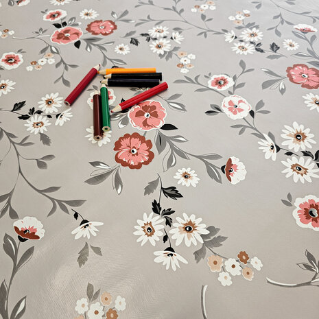 Prachtig tafelzeil met een sfeervolle afbeelding met fleurige bloemen op een grijze achtergrond! Dit sfeervolle tafelkleed van pvc kunnen wij voor jou per 50 cm op maat snijden. Het tafelzeil is al verkrijgbaar vanaf 50 centimeter. - Breedte: 140 centimeter - Lengte: Vanaf 50 centimeter tot 25 meter (een rol tafelzeil) - Weergegeven prijs is per halve meter - Materiaal: Geprint pvc met zachte non woven vliesrug - Machinewasbaar: Nee