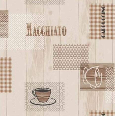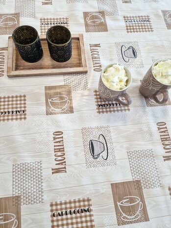 Koffie liefhebbers opgelet! Dit leuke tafelzeil is echt wat voor jou! Wij snijden het per 50 cm voor je op maat. - Breedte: 140 centimeter - Lengte: Vanaf 50 centimeter tot 20 meter (een rol tafelzeil) - Weergegeven prijs is per halve meter - Materiaal: Geprint pvc met zachte non woven vliesrug - Machinewasbaar: Nee
