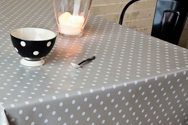 Proefstaaltje: Tafelzeil stippen lichtgrijs/beige Paty € 2,25