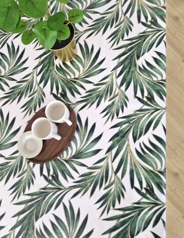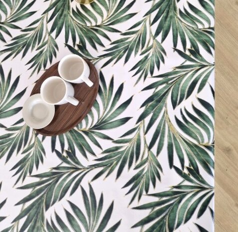 In het tropische regenwoud vind je tal van groene bladeren. Wil jij ook zo'n natuurlijke, groene sfeer in je woning uitstralen? Kies dan voor dit tafelzeil! Omdat er slechts met enkele kleuren wordt gewerkt, oogt deze print ook niet te druk. Een combinatie met goudkleurige of zwarte tafel accessoires kleedt het geheel erg mooi af. Bestel op maat via onderstaand menu. - Breedte: 140 centimeter - Lengte: Vanaf 50 centimeter tot 20 meter (een rol tafelzeil) - Weergegeven prijs is per halve meter - Materiaal: Geprint pvc met zachte non woven vliesrug - Machinewasbaar: Nee