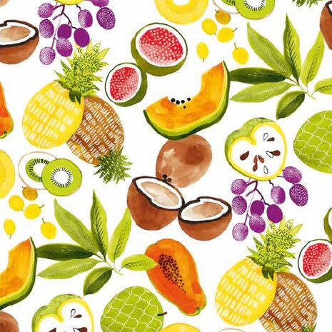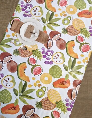 Tafelzeil met ananassen, kokosnoten, meloenen, kiwi's en meer! Dit héérlijke tafelzeil zou je bijna willen opeten! Het zorgt voor een gezellige uitstraling aan je tafel. Wij snijden het per 50 cm voor je op maat. - Breedte: 140 centimeter - Lengte: Vanaf 50 centimeter tot 20 meter (een rol tafelzeil) - Weergegeven prijs is per halve meter - Materiaal: Geprint pvc met zachte non woven vliesrug - Machinewasbaar: Nee